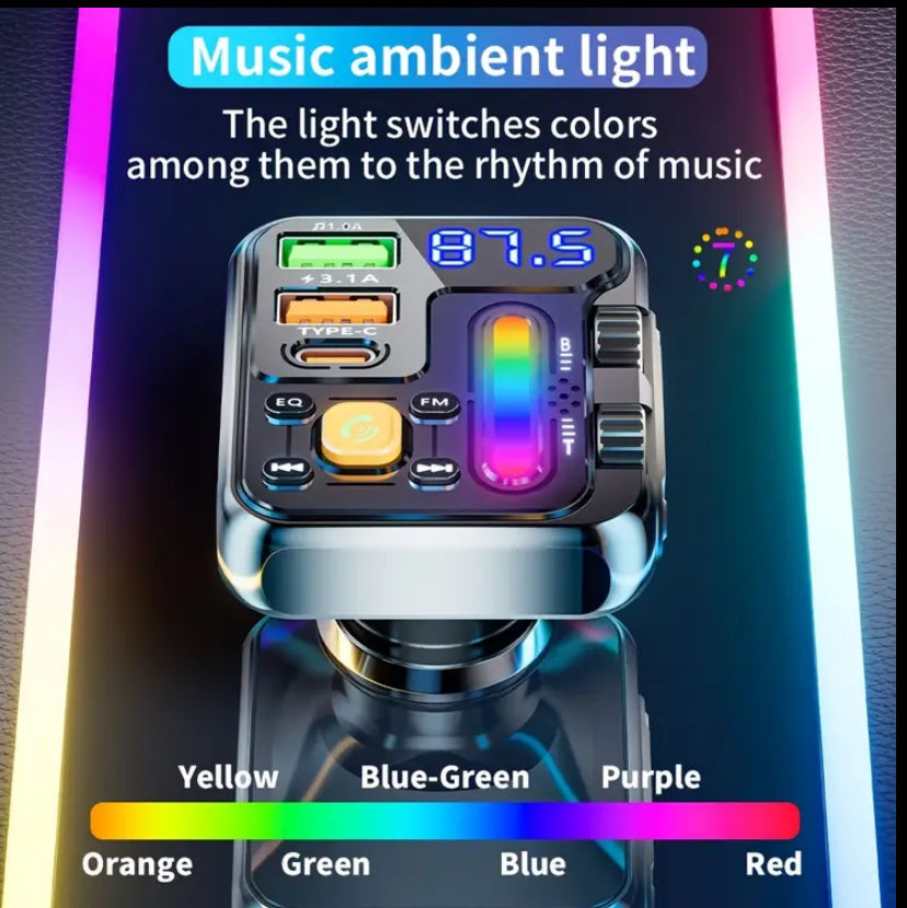 Wireless Car Charger FM Transmitter, Dual USB and Type-C Fast Charging, Large Knob and Dual Wheel Design - for Adjusting the Sound Volume, Handsfree Calling, USB Drive Support, Universal Fit for Smartphones, Without Battery